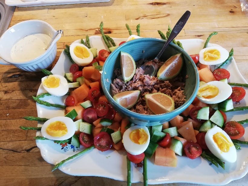 Skær det nederste af aspargeserne og kog dem ca. 2 min i letsaltet vand, hæld dem i en si og overbrus med koldt vand. Afdryp. Skær melonen i tern og dryp med citronsaft. Skær agurken i tern og tomaterne i halve. Fordel asparges, melon, agurk og tomat på et fad eller i portionsskåle. Fordel halve smilende æg over salaten sammen med afdryppet tun.