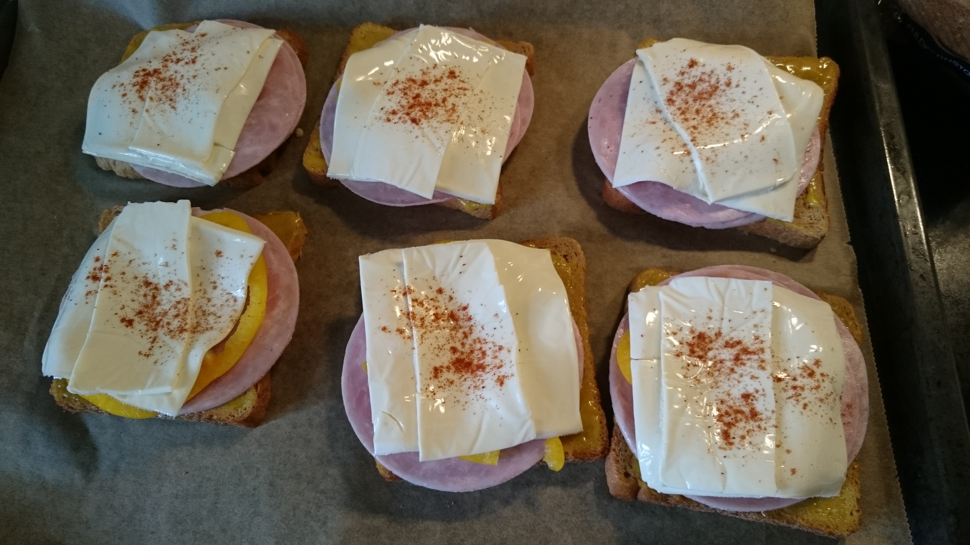 Smør brødet med smør og sennep. Læg skinken på og pynt med 1-2 peberfrugtringe. Læg skinken på og drys med paprika. Læg brødene på en plade med bagepapir. Gratiner ved 250 gr til osten er smeltet, ca 10 min. Hold øje