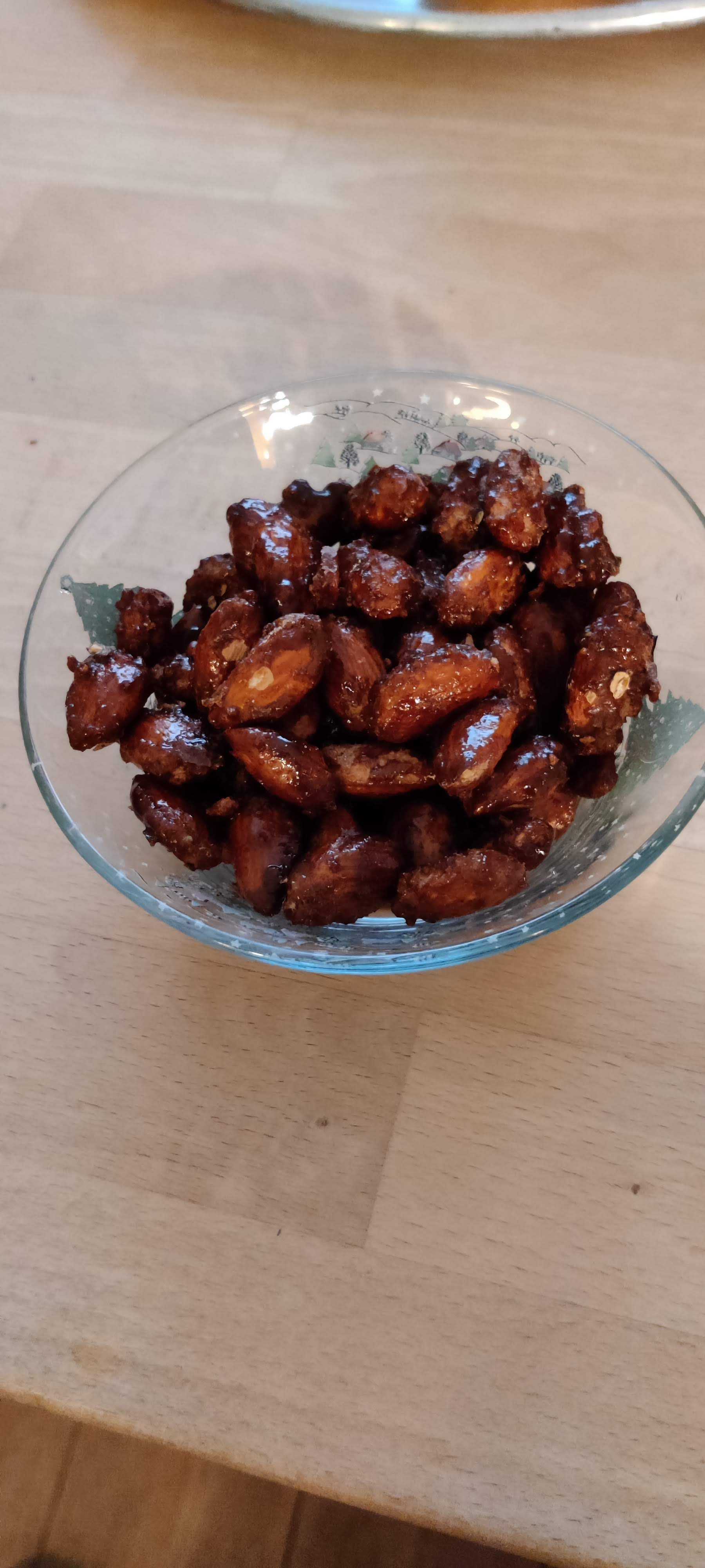 Det hele hældes på en pande og varmes op til sukkeret bliver hvidt og tørt. Fortsæt med at varme mandlerne under omrøring til sukkeret er brunt og flydende og mandlerne blanke. Skru evt. ned for varmen. Spred mandlerne ud på et bagepapir og lad dem køle af. Opbevar i lufttæt glas