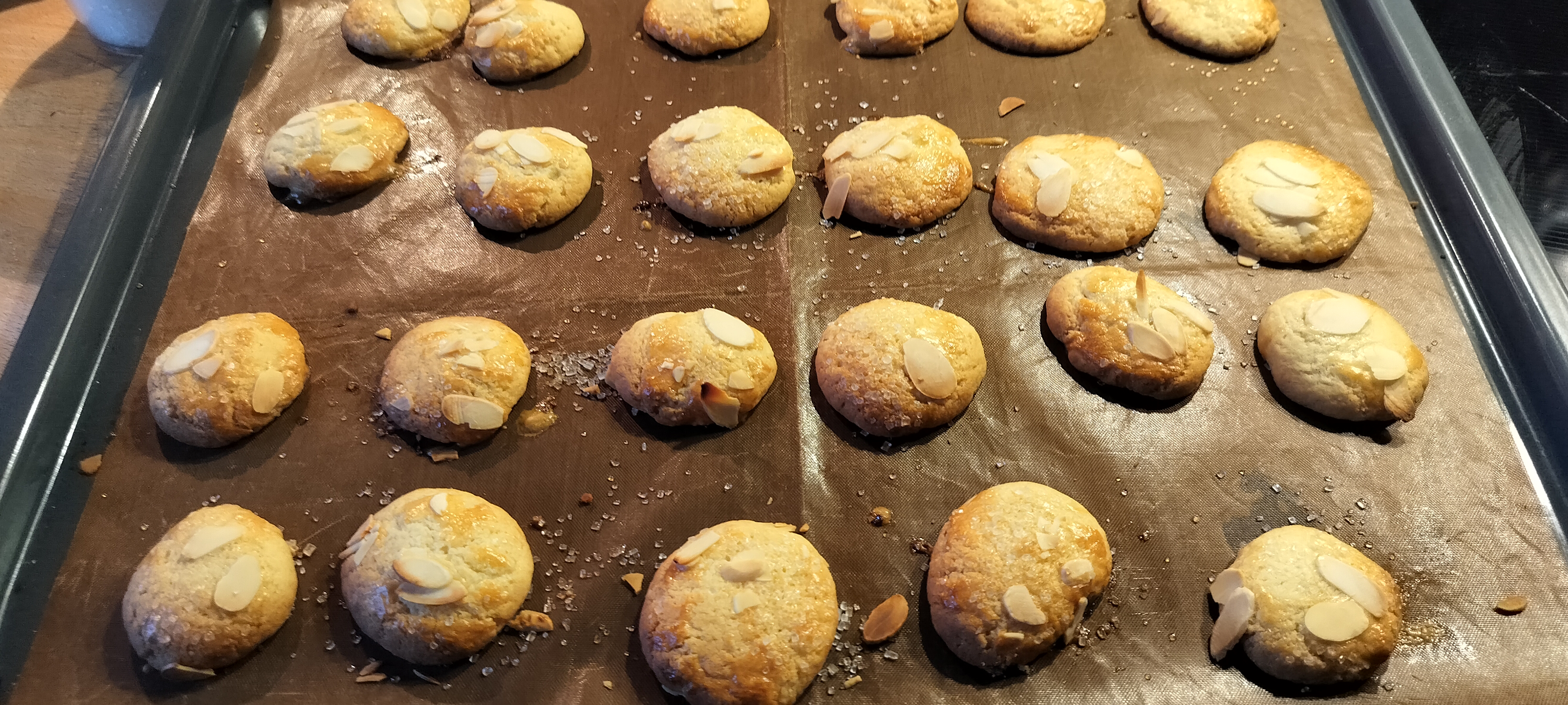 Bland mel, bagepulver og vanille. Smuldr smørret i og tilsæt sukker og sammenpisket æg. Ælt til dejen godt sammen og tril den til en pølse. Skær den ud og tril dejen til kugler på størrelse med en lille hasselnød. Læg kuglerne på en plade med bagepapir og tryk dem lidt. Pensl med æg og drys med mandler og evt perlesukker. Bag ved 200 gr i ca. 7 min. Afkøl på bagerist