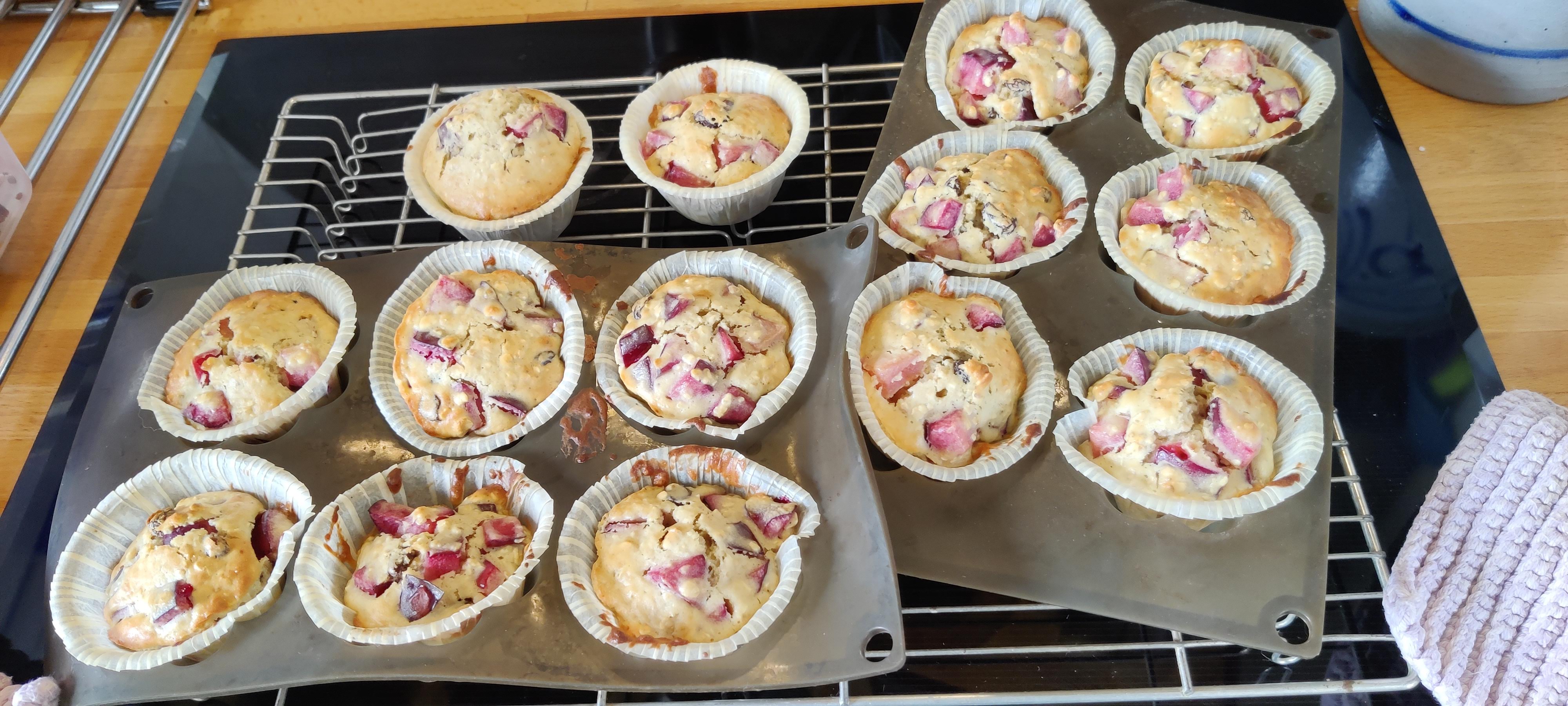 Pisk æg og sukker hvidt og skummende. Sigt mel sammen med bagepulver og vanilje og ved det forsigtigt i dejen. Tilsæt havregryn, olie og mælk. Skær blommerne ud i små tern og tilsæt dem sammen med rosiner. Vend rundt med dejskraber. Fordel i muffinforme som skal smøres hvis du bruger papirforme. Bages 20-25 min ved 180 gr alm ovn