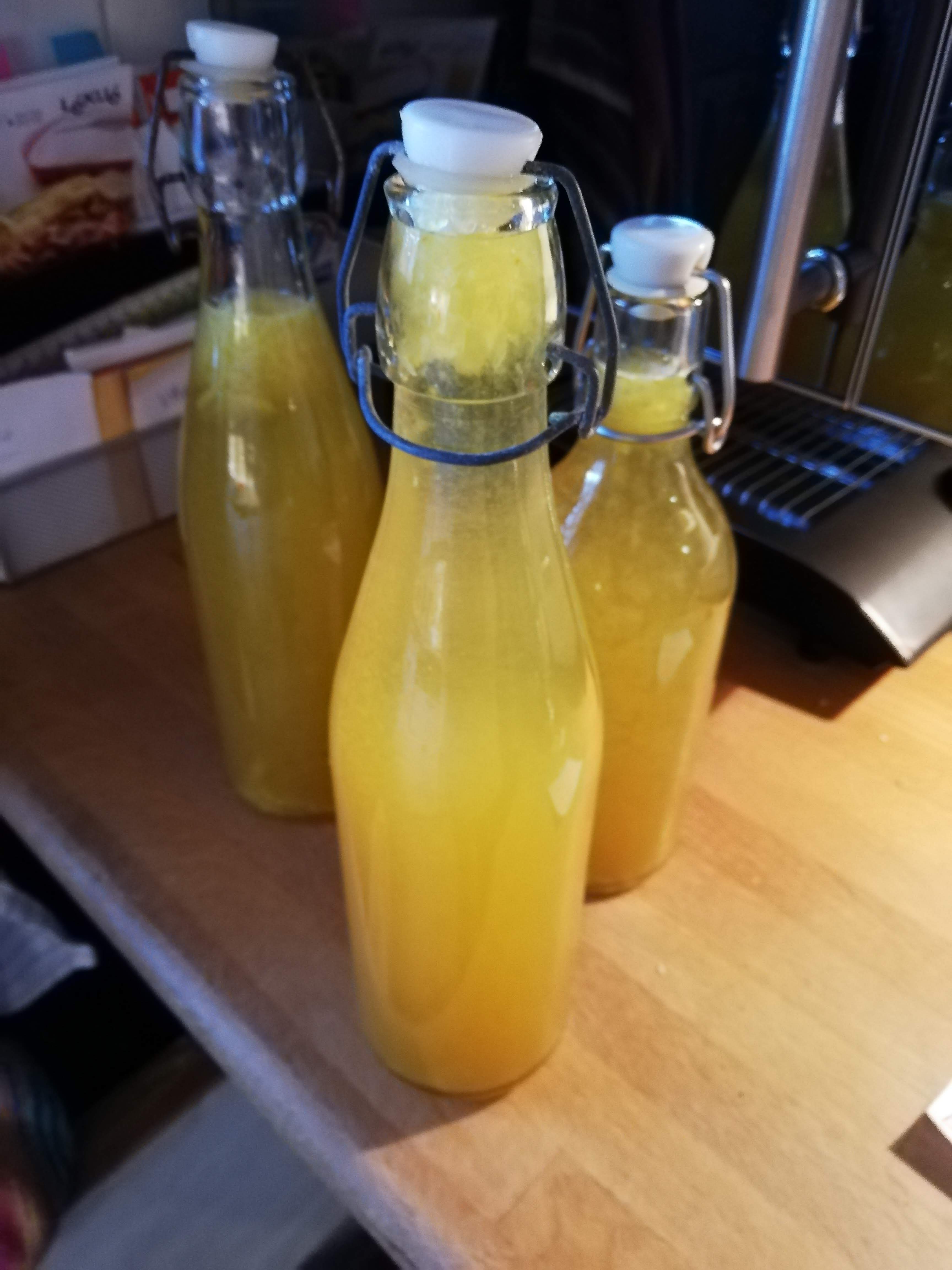 Citronerne vaskes, skallen rives fint - kun det gule. De presses og saft samt pulp gemmes under låg i køleskabet imens rødderne koges.
